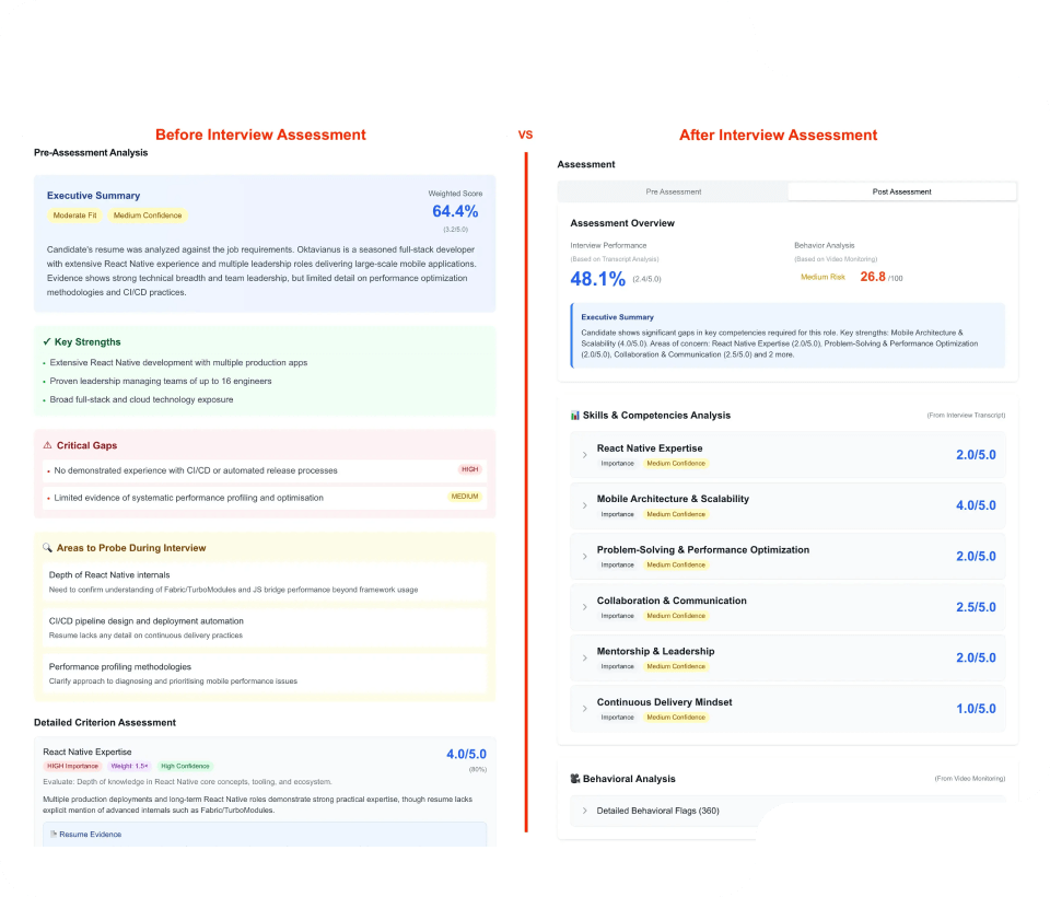 Each interview is evaluated using structured, role-specific rubrics with evidence pulled directly from the candidate’s responses.
